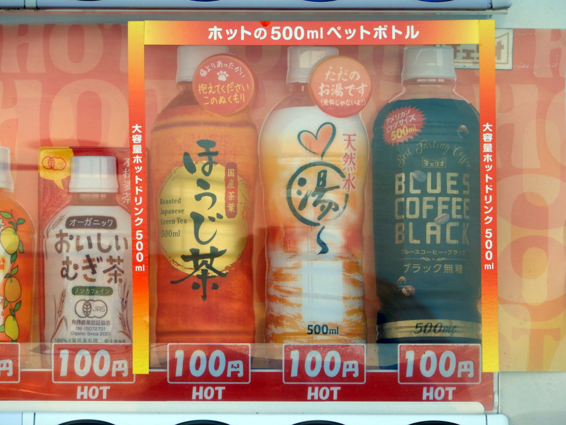 他の商品を見ると,お湯の隣には500 mlのほうじ茶,そしてその横には多分350 mlであろうむぎ茶.