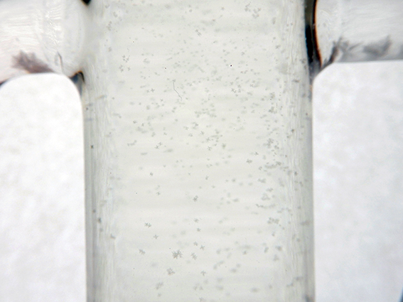 と,ここまで書いて1階に下り,ストームグラスを見たところ,結晶が成長していた.羽毛状結晶のほか溶液中に細粒結晶が浮遊している.これは天気が下り坂の兆しとのこと.確かに今夕から週末まで,天気はぐずつくらしい.週明けに天気が回復する時にはどうなるか楽しみだ.