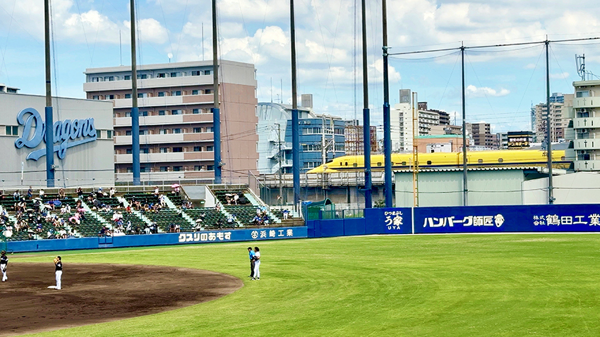 ウェスタンリーグの試合が行われているナゴヤ球場の内野席から一瞬見えるドクターイエロー.10/20のようなシーンは再現できないが,そんなドクターを待ち伏せするために,あえて1塁側スタンドの端っこに陣取った今日.