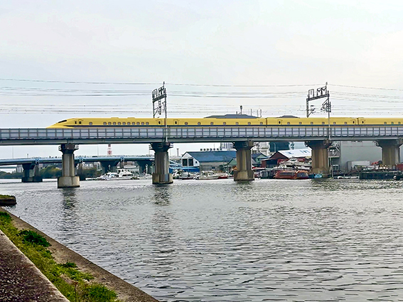 急遽,堀川沿いに移動し東海道新幹線堀川橋梁を渡るドクターを待った.