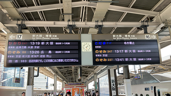 まずは,名古屋駅の新幹線ホームの電光掲示板で,900番台の回送列車(これが,ドクターイエローの本名らしい)が,のぞみ69号に続いて入線することを確認.確かに東京から博多を目指して走っている.