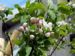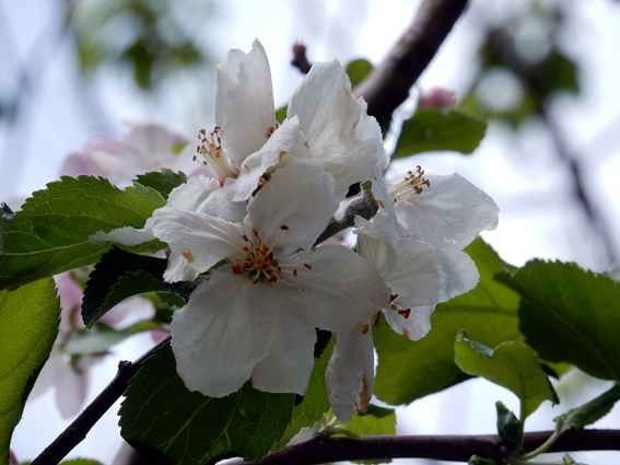 理学部E館の前では,小林・益川両先生が記念に植えられた,「ニュートンの林檎」が花を咲かせています.(7800)