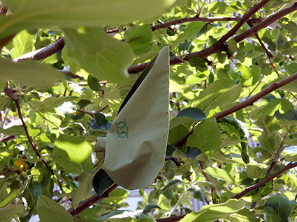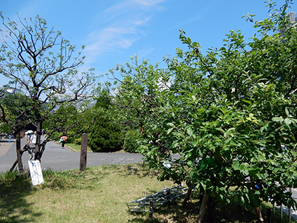 気にはなって自転車で通りかかるときに見ていたが,実がなっているようには見えず,今年は結実しなかったのかと半ば諦めていた. しかし,今朝訪れてよく見ると,緑色の袋がかけられた実が10個くらい.木遁の術だったのか.この実もHCDの際に披露されるはず.