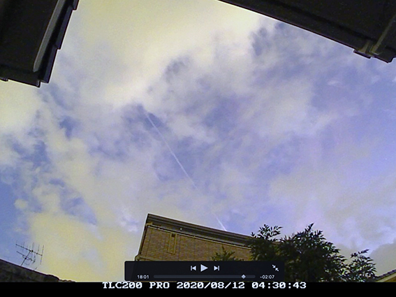 日の出少し前の04:30に,ひとつだけ明瞭な流星を捉えることができた.かなり明るい時間帯でなおかつ雲を通して光跡が写っているので,かなり明るかったのだろう.ひょっとしたら,流星痕?