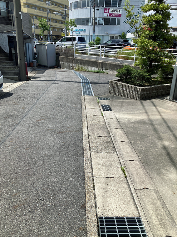 細い路地が,東西に走る片側二車線の県道217に切られている,しかも,その間には50 cm程度の高低差があり,両者はつながっていない.