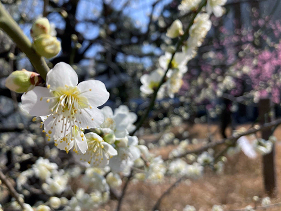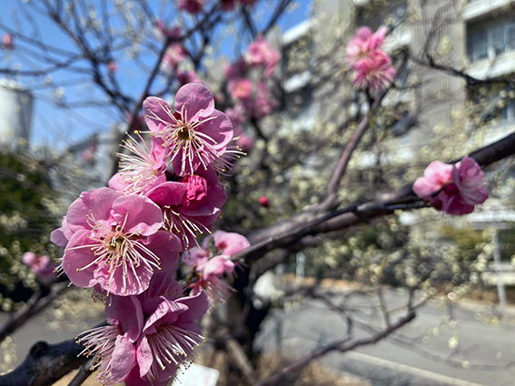 東山キャンパスの紅梅は満開近し,白梅はもう少しで満開.