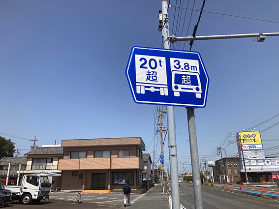 調べてみたら,逆で限度緩和指定道路を示し,この先の交差点で交差する県道265および522を,限度(20 tおよび3.8 m)を超える自動車も右・左折可であることを意味するそうな.ということは,この標識がある,国道247と155は必然的に限度緩和指定道路なのだろう.なんとなく判ったようなわからないような.