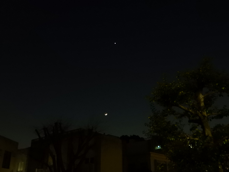 理学部E館を出ると正面に三日月と金星. 写した後,Lineを見ると配偶者から,「お月さまがめちゃくちゃ細くて美しい.お母みたい」と,家族宛になんともコメントのしようがないメッセージ.