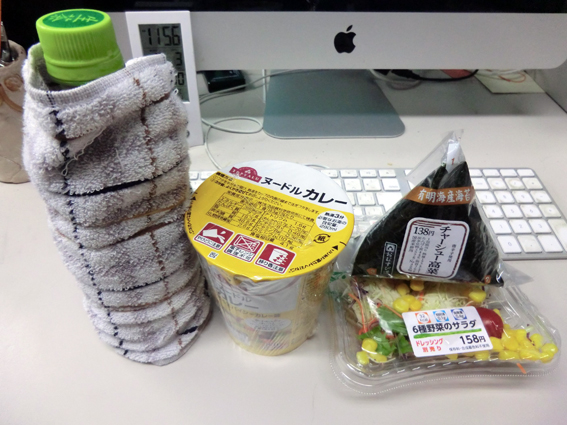 さて,今日の昼食は,自宅にあった賞味期限を8日間過ぎたカップ麺,そして途中のコンビニで買ったおにぎりとサラダ.