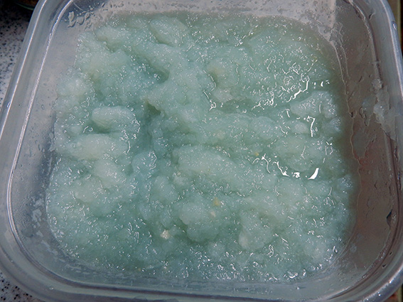 前回,すりおろしたタマネギとニンニクを電子レンジで加熱したところ,鮮やかな薄緑青色になった.レシピとは違い酢を加えてから熱したためかと思い,今回はレシピどおりタマネギとニンニクのみを混ぜて加熱してみた.
