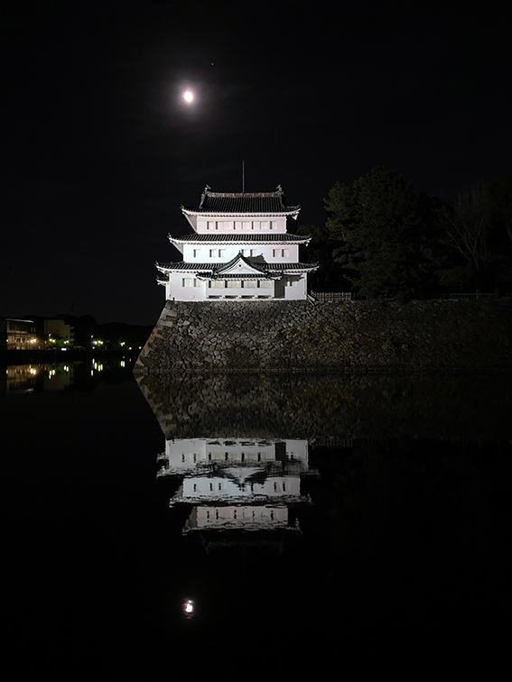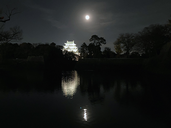 ライトアップされた名古屋城とコールドムーンの共演.