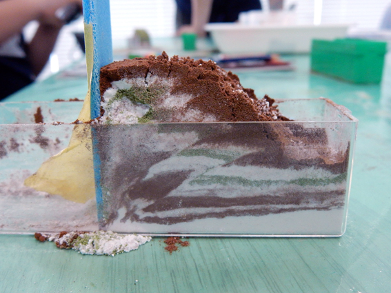 午前中は,減災館の見学と地震と防災のお話し,小麦粉,ココアと青汁を使った断層形成モデル実験,そしてシカマイア石灰岩で記念品づくり.どのグループも綺麗な逆断層ができました.