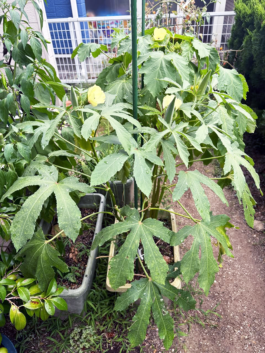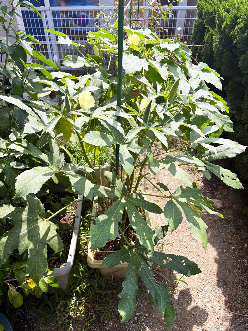 08:25撮影 昨日夕方に比べると,オクラの萎れ具合は多少解消.でも前日07/29夕方に給水した07/30朝と比べると多少萎れている.