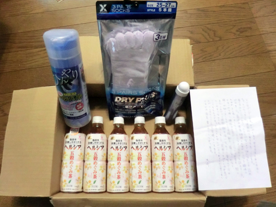 父の日のプレゼントだそうで,健康飲料,熱中症予防のクールタオル,足の防臭剤と五本指ソックス(足の踏ん張りが効くようにと水虫防止用だとか)の詰め合わせ.ちなみに,私は水虫ではありません.念のため.