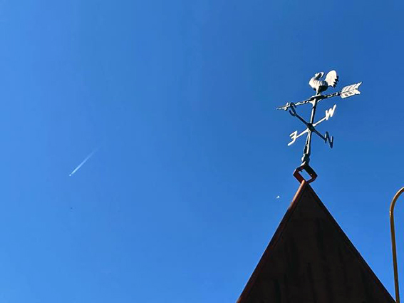 2.飛行機が2機飛んでいる.一方だけに飛行機雲.飛行高度の違いにより外気温に差があるためか.