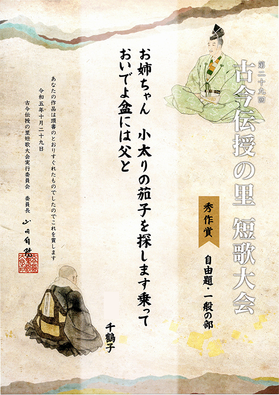 母の部屋を片付けに行くと,古今伝授の里短歌大会から,短歌秀作賞の連絡が届いていた.