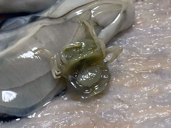 貝に住み着く(寄生する)カニ(ピンノ カクレガニ)の一種らしい.