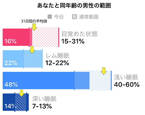 塗りつぶしは昨夜のデータ.斜線領域は通常とされる範囲.黄色矢印は31日間の平均.