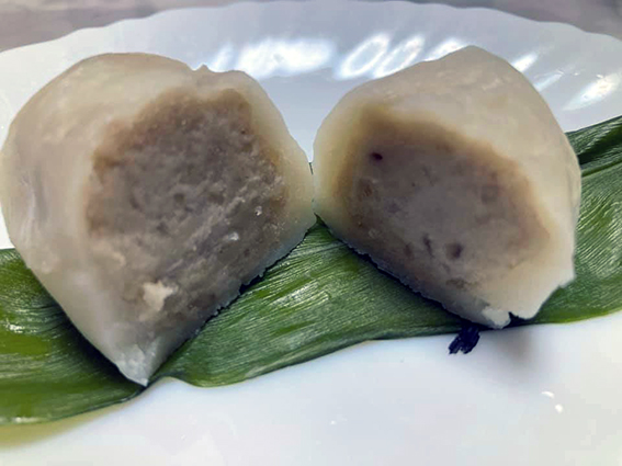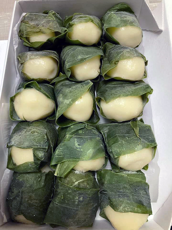 空豆で作った餡を,小麦粉と米粉からなる生地で包み,それを茗荷の葉で巻いたものを,蒸してつくられる.