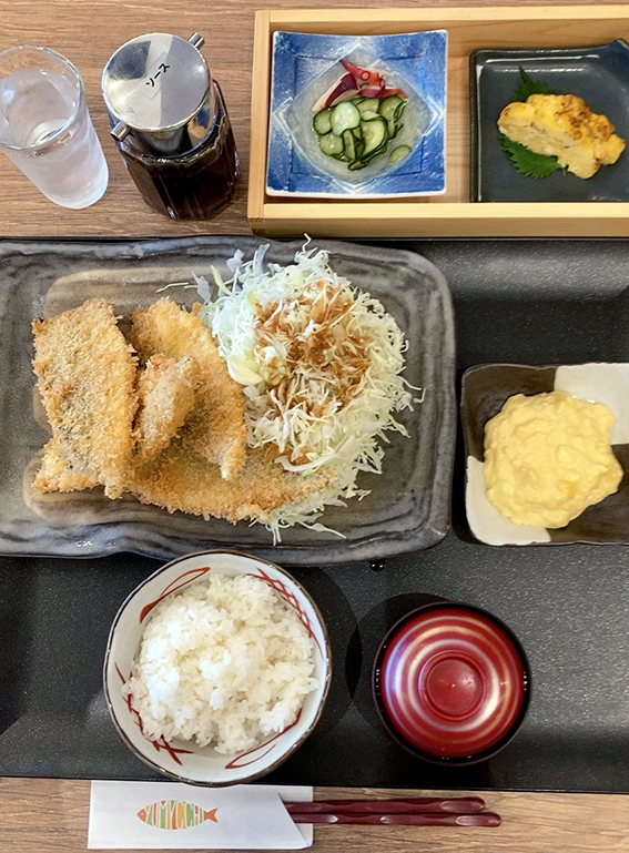 次に,これが所用かどうかは議論の余地があるけれど,「さかなと米にこだわったシュフ's ユミッチ」で,鯵フライランチ.