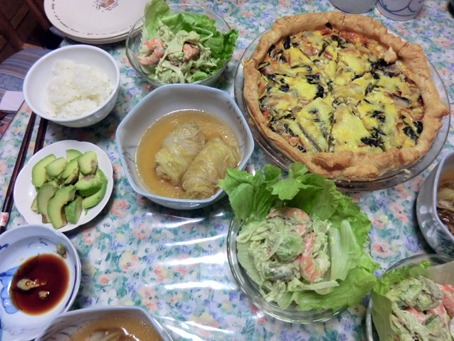 キッシュ,ロールキャベツならぬロール白菜とアボカド+海老のサラダ.