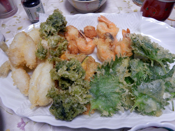 数年前からは,娘たちがつくるようになっていましたが,完全に世代交代はできずに,今年は食材の用意と前処理は娘たち,揚げるのは私という状態に戻りました.ビールを飲みながらの料理長でした. この後,キノコ類,茄子,ビーマン,サツマイモ,かき揚げと続き,さて食べようとした頃には,ビールだけでほぼ満足. アオサの天ぷらは,特に美味でした.