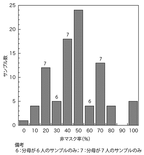ヒストグラムを描いてみると,30%代と60%代のサンプル数が少ない.これらは分母が6人の時にのみ現れる非マスク率.7人のケースが圧倒的に多いので(72%),このような凸凹が出来てしまう.