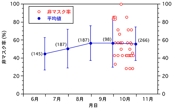 2.非マスク率が0% , 14% (1/7)や17% (1/6)の場合が認められない.これは9月までには見られなかった傾向.