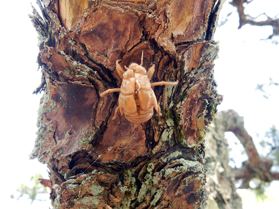 お寺の参道の松並木で,蝉の幼虫の抜け殻発見.見つけた瞬間は,昨年の夏から風雪に耐えたかと感動したが,いくらなんでもそれは.....ひょっとしたらハルゼミ.調べてみると,季語「松蝉」はハルゼミのことを指すように,主に松林に生息するらしい.そうすると,ますますハルゼミの可能性大か.