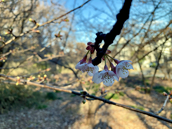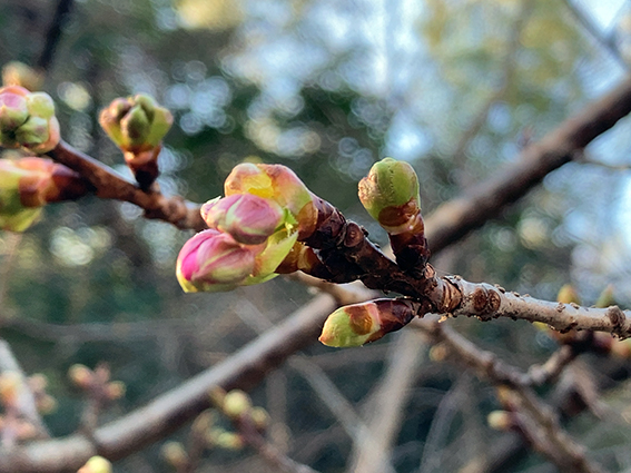 ・河津桜の私的標本木@井堀の棚田訪問 昨年と3年前は、今頃数輪咲いていた 今年は、つぼみ膨らむ 3年前から訪れている根嶽では、1本の若木で数輪咲いていた。(13400 歩)