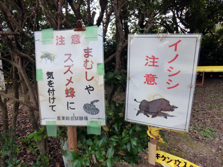 ←水源まで続くはずの道の入り口までたどり着くと,イノシシ,まむし,スズメバチ注意の表示と立ち入り禁止のテープ.