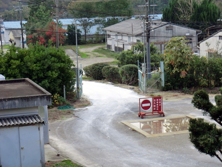 別の入り口を探すと,防疫のため立ち入り禁止.道路にまかれている白い粉は,鳥インフルエンザ対策の薬?→
