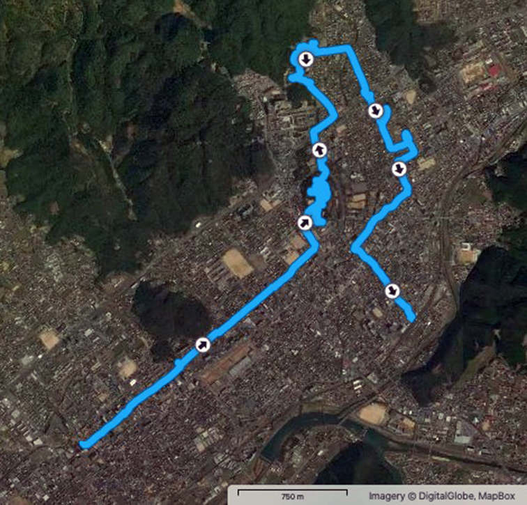 座学と酒と移動の繰り返しで,体がなまってきた.そこで午前中は湯田温泉からとなり駅の山口まで散歩.両駅間は2.4kmなれど,実歩行距離は12.3 kmだった.
