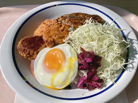 本来は乗務員のまかない飯のハムエッグ丼.ここのハチクマライスは,ハンバーグなどがついていて,名前を思い出せないが,どちらかと言えばハワイのローカルフード目玉焼きハンバーグライスといったところか.