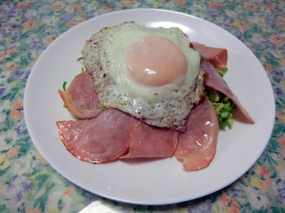 基本は目玉焼き丼で,いろんなバリエーションがあるようですが,今回作ったのは,ご飯の上に刻んだキャベツ,焼いたハムそして目玉焼きを乗せるという極めてシンプルなもの.マヨネーズと醤油をかけてみました.