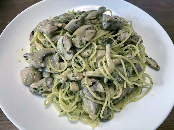 これでパスタ。具材は、マッシュルーム、しめじと鶏肉。