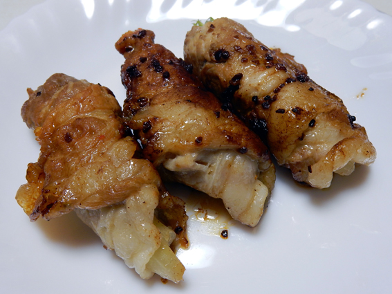 味醂とおろし生姜を合わせた味噌を挟んで,豚肉のスライスでまき,ニンニクを加えたオリーブオイルでじっくり焼いた一品.ビールの友としてもピッタリ.