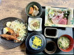 尾鷲イタダキ市(毎月第一土曜 すなわち今日)で,魚ご飯 アオサの味噌汁 ブリのハラス(これがなんと100円でとてつもなく美味い)