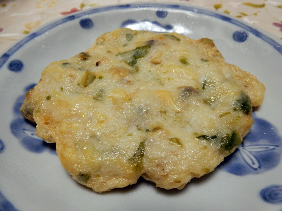 「菜の花とあさりのかき揚げ」という名の練り物(豊橋より)を肴に桃川の杯.