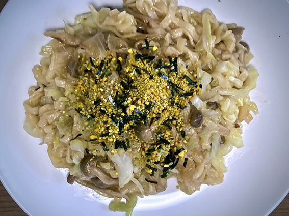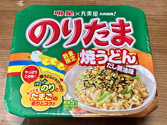 今日は,本当のカップ麺をフライパンで焼いてみた.明星と丸美屋のコラボ製品「のりたま燒うどん」.