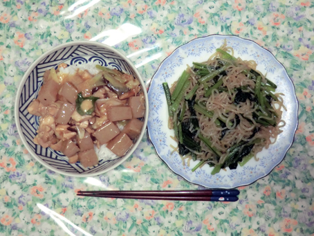 冷蔵庫をのぞくと,コンニャクがあった.そこで昨日テレビで紹介していたコンニャクと鶏肉の和風どんぶりを作ることにする.レシピはうろ覚えなので,味付けは適当.