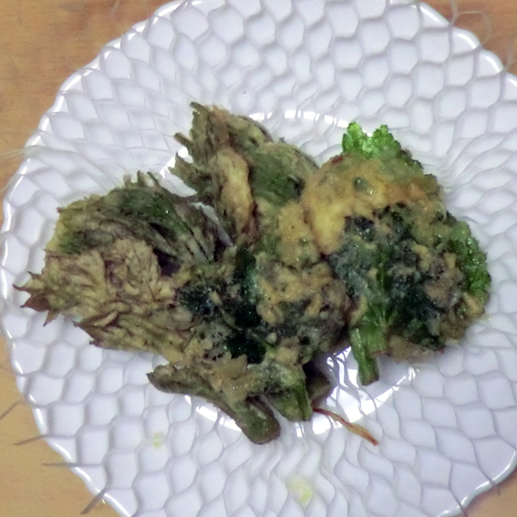 今年は無理かなと思っていたら,配偶者がどこからかタラの芽をいただいてきました.それに,我が家の庭で野生化し巨大化した三つ葉.天ぷらにして,昔,旅先で思わず買ってそのままになっていた茶塩で,美味しくいただきました.そして,ワケギのぬた.