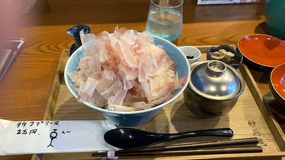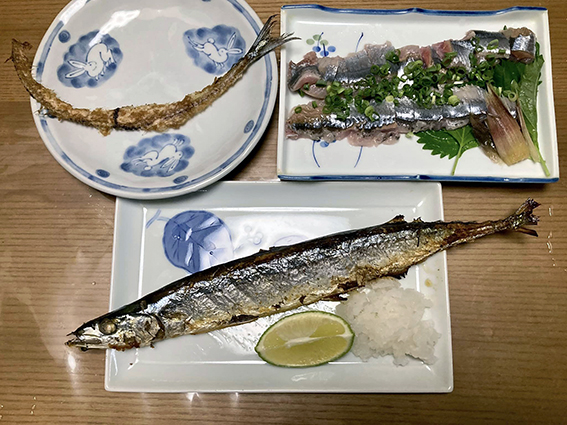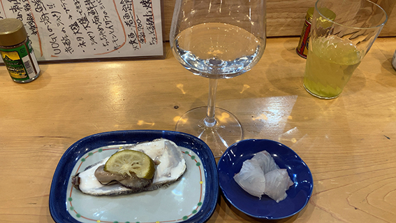 趣味で釣った鯛を寝かせて,大将に出来具合についての意見を求める人あり.牡蠣の皿の右にある小皿は,そのお相伴.