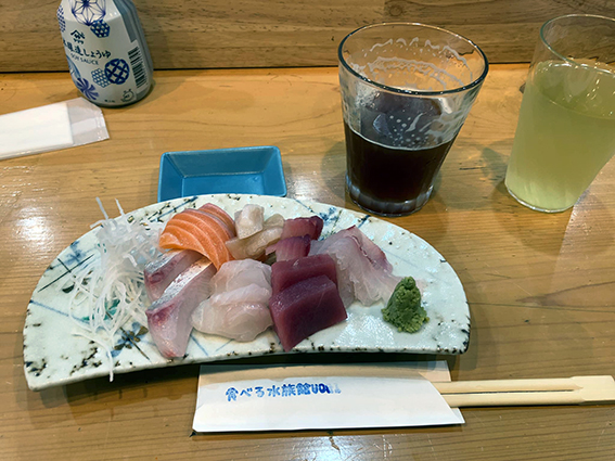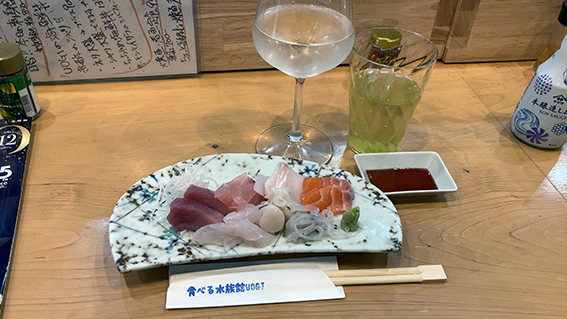 そんなわけで(どんなわけだ)帰り道,創業113年の魚屋さんのイートイン「食べる水族館 魚ぎ (UOGI)」に立ち寄って昼飲み.