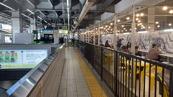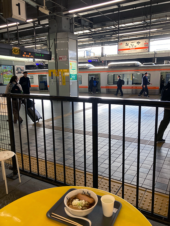 もう一箇所.名古屋駅1番線上に期間限定で営業中のラーメン店 大阪「人類みな麺類」へ.リニア工事のため一時的に閉鎖されている所の有効活用.