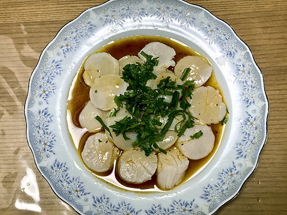 酒の肴のもう一品は,ホタテの我流和風カルパッチョ.ネット情報で,15秒ほど湯がき,氷水で冷やすと良いとあった.確かに甘みがでたような気がする.