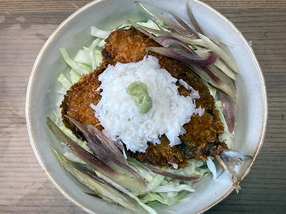 それを使った昼食は,わさびおろし鰺フライ丼.醤油の代わりに,できあいのおろしタマネギ・大根ポン酢.残っていたミョウガを少々.