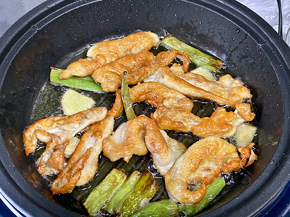 午前中に,いろんなレシピを参考にして,鶏油をつくってみた.低温で焦がさないようにじっくりと40分.なかなか根気のいる作業で私には向いていないが,電熱グリルパンで温度調節も上手くできた.