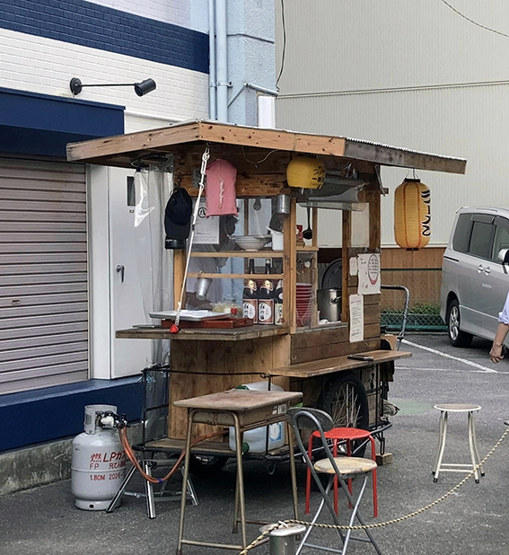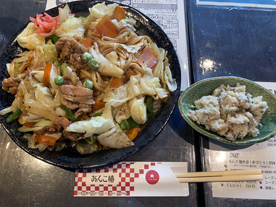 気持ち太い平打ち麺の醤油味で、一見すると焼きうどんみたい。野菜たっぷり版を無理を言って作ってもらった。硬い豆が入っているなと思ったら、春日井のグリーン豆だった(多分)。ここのお店、遊び心がある。