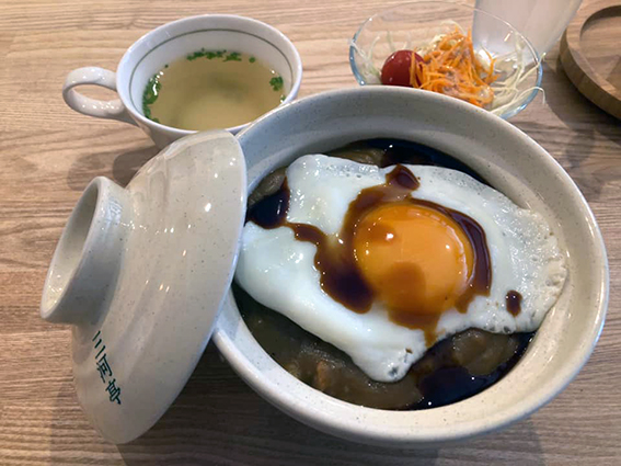 高等ライス:丼のカレーライスに目玉焼きがのっており,それに自家製のソースをかけていただく.カレーがまだ高級洋食だった頃の名前が,そのまま受け継がれている.